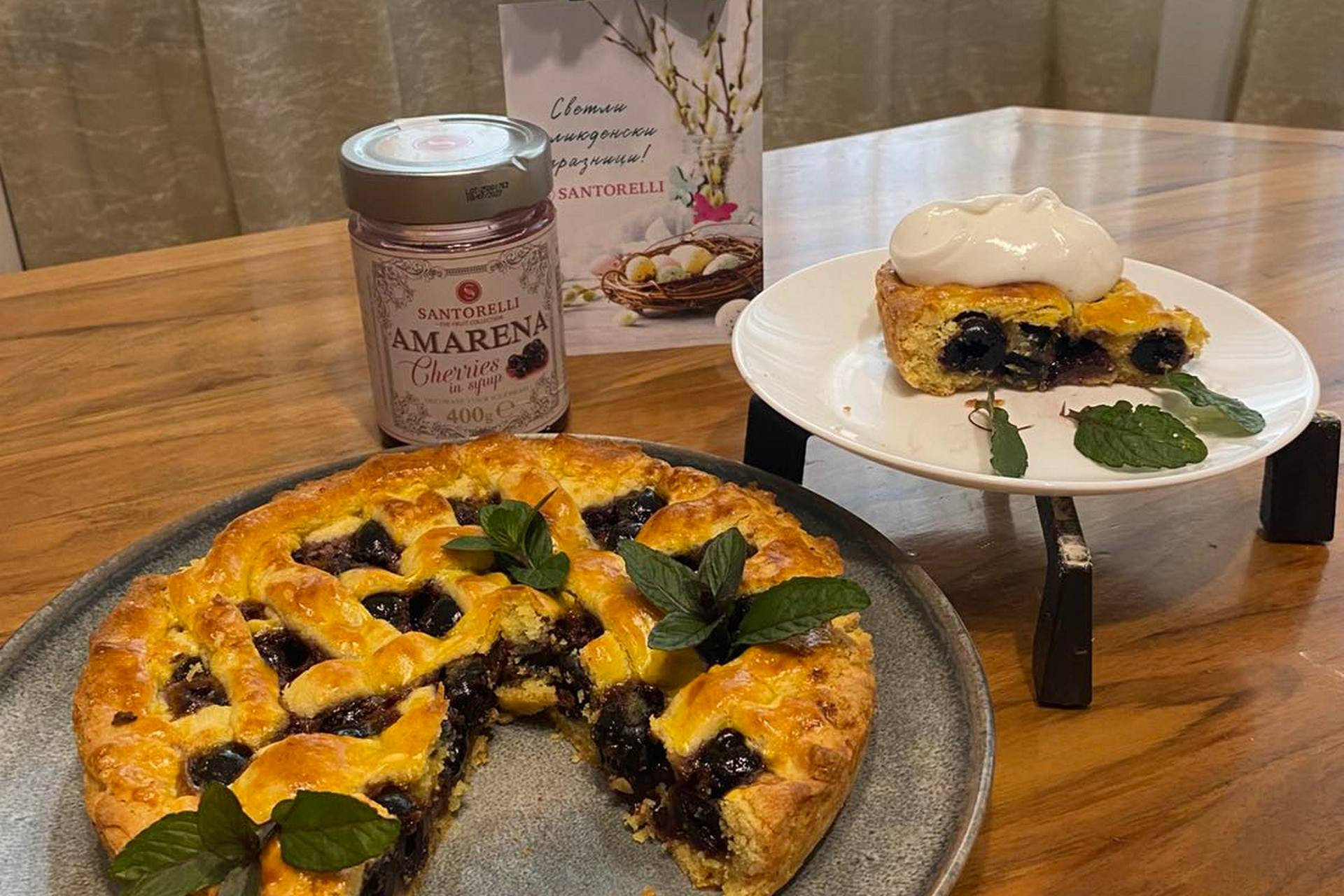 Once the tart base turns a very light golden color, remove it from the oven. Spread the Amarena cherries on top, then make thin strips from the reserved dough and place them over the tart in a lattice pattern. Brush the strips with beaten egg yolk.